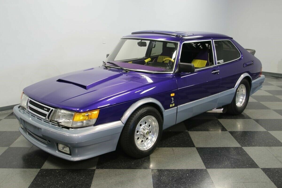 Le style extérieur de cette Saab 900 est également unique, avec une livrée bicolore associant le violet en partie haute, au gris en partie basse. L’ensemble est complété par des jantes aluminium signées Weld Racing, des antibrouillards Hella, une prise d’air sur le capot, ainsi que des badges « Cobra » et « 5.0 ».